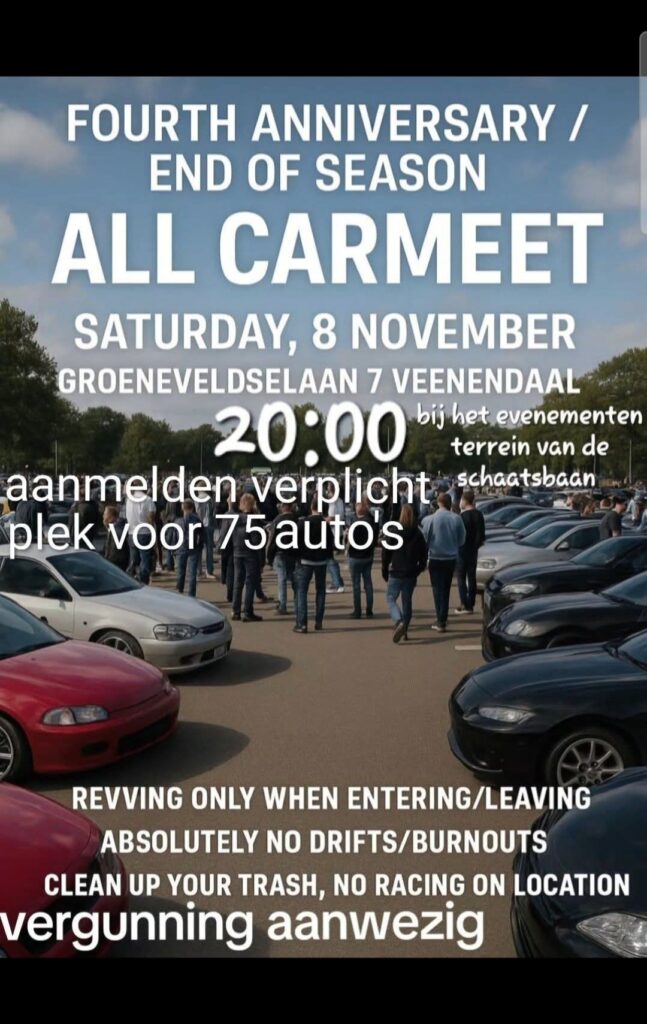 Op deze meeting is een vergunning aanwezig graag aan de regels houden er is plek voor max 90 auto’s op de flyer staat 75 maar het is 90 aanmelden kan bij mijn insta met de eerste 3 combinaties van je kenteken